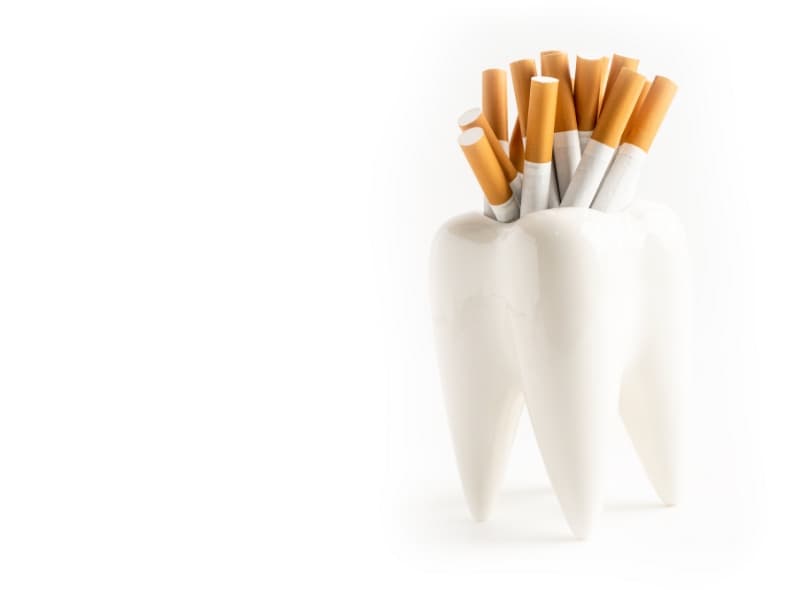 タバコに含まれる「タール」は粘着力が非常に強く、歯の表面にこびりつくことで褐色の汚れになります。さらに、タールで表面がザラつくと新たな色素も付着しやすくなり、黄ばみが加速します。