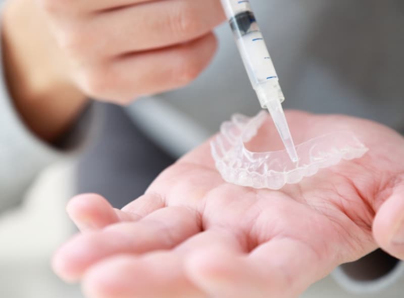 ご自宅で自分のペースで進められるホワイトニング方法です。患者さま専用のマウスピースを作製し、薬剤を注入して毎日一定時間装着します。時間をかけて徐々に白くしていくため、自然な仕上がりになります。通院回数を抑えたい方に適しています。